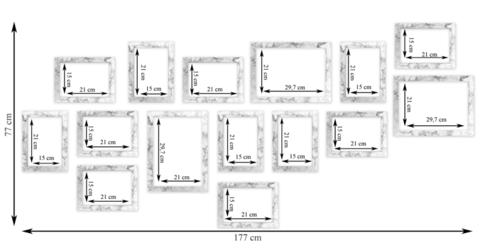 Szablon rzeczywistej wielkości 1:1 sprawia, że bez problemu można odtworzyć prezentowany układ ram, bez potrzeby żmudnego procesu mierzenia i poziomowania.
