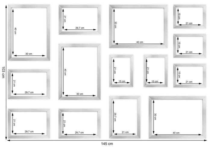 Szablon rzeczywistej wielkości 1:1 sprawia, że bez problemu można odtworzyć prezentowany układ ram, bez potrzeby żmudnego procesu mierzenia i poziomowania.