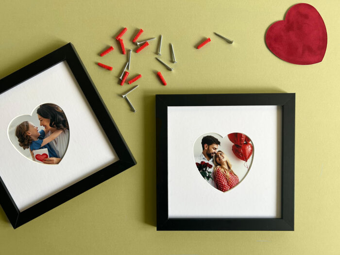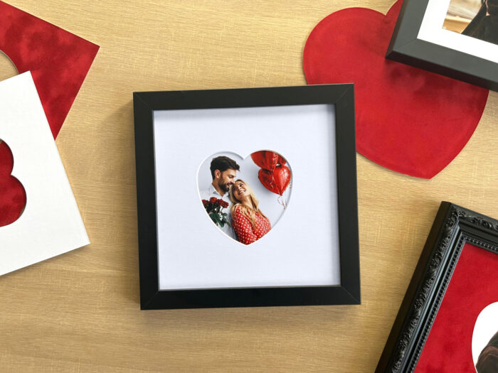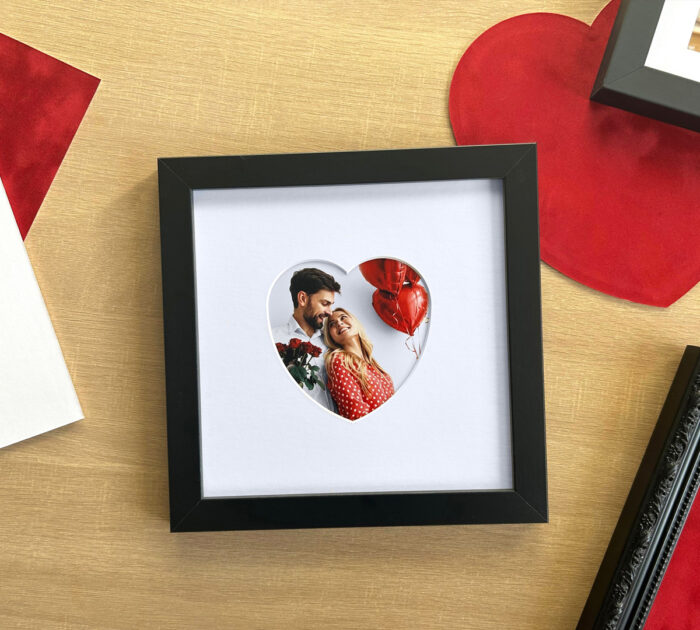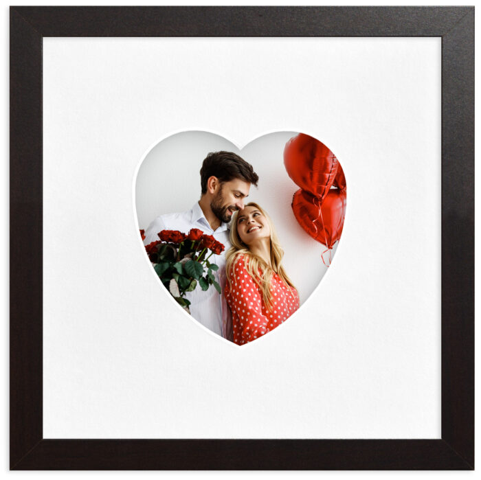 - Elegancki design – połączenie klasycznej czerni z czerwonym, welurowym passe-partout w kształcie serca podkreśla romantyczny charakter zdjęcia.