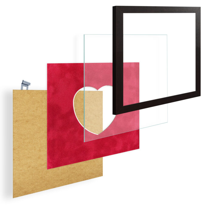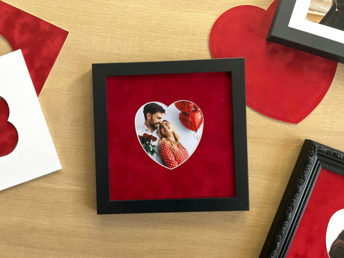 - Elegancki design – połączenie klasycznej czerni z czerwonym, welurowym passe-partout w kształcie serca podkreśla romantyczny charakter zdjęcia.