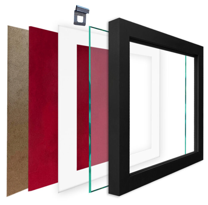 - Passe-partout: białe passe-partout z okienkiem oraz dwa welurowe passe-partout w kolorze bordowym oraz granatowym.