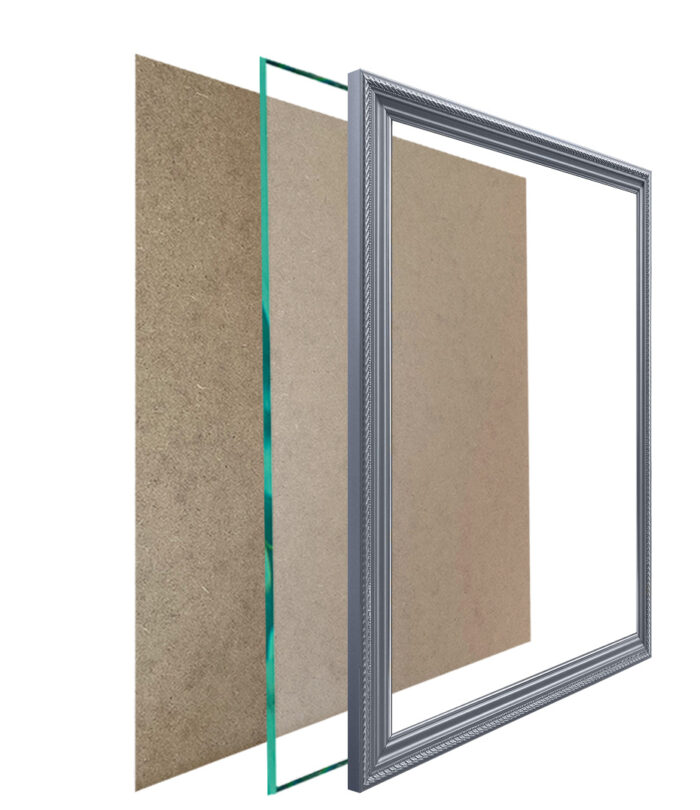 Każda z naszych ramek zawiera tył w postaci płyty HDF i dwie zawieszki, które umożliwiaką zawieszenie ramki zarówno w pionie, jak i poziomie.