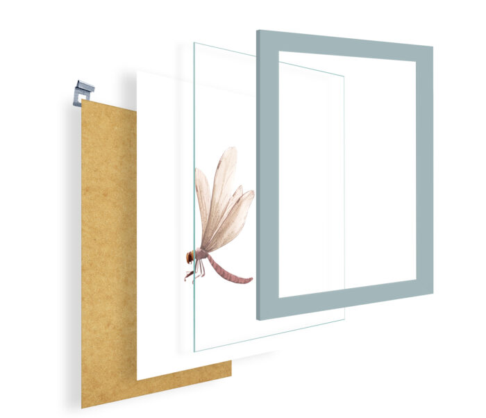 Każda z naszych ramek zawiera tył w postaci płyty HDF i uniwersalną zawieszką, która umożliwia zawieszenie ramki zarówno w pionie, jak i poziomie (formaty 30×40 i 30×42 a3 posiadają tylko zawieszkę zmienną, bez stopki).