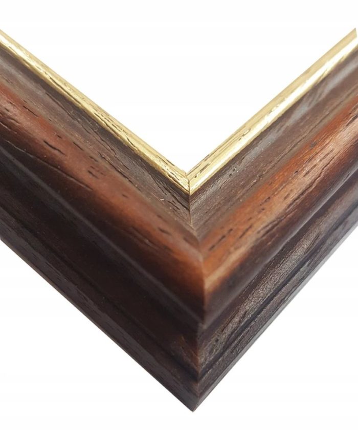 - Kolor: brąz ciemny ze złotym paskiem (widoczna struktura drewna, intensywność koloru zależy od partii drewna, jako że jest to materiał naturalny, każda rameczka może się minimalnie różnić, tył ramki nie jest malowany)