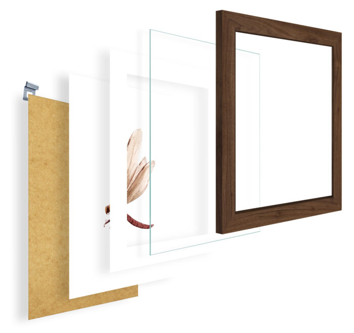- Ramka razem z passe-partout, szkłem, zawieszką i płytą HDF.