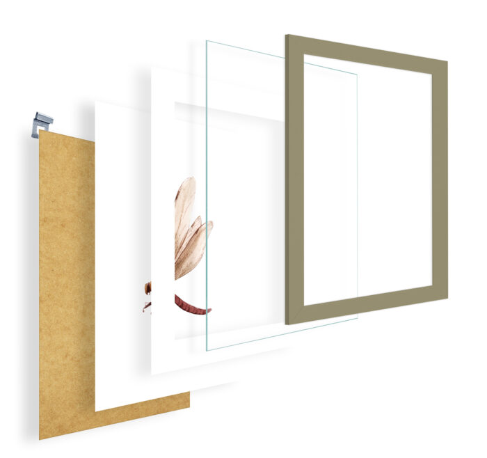 - Ramka razem z passe-partout, szkłem, zawieszką i płytą HDF.