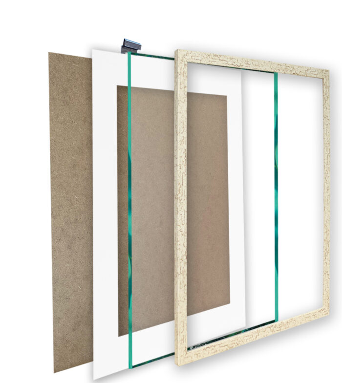 - Ramki razem ze szkłem, stopką, zawieszką i płytą HDF.